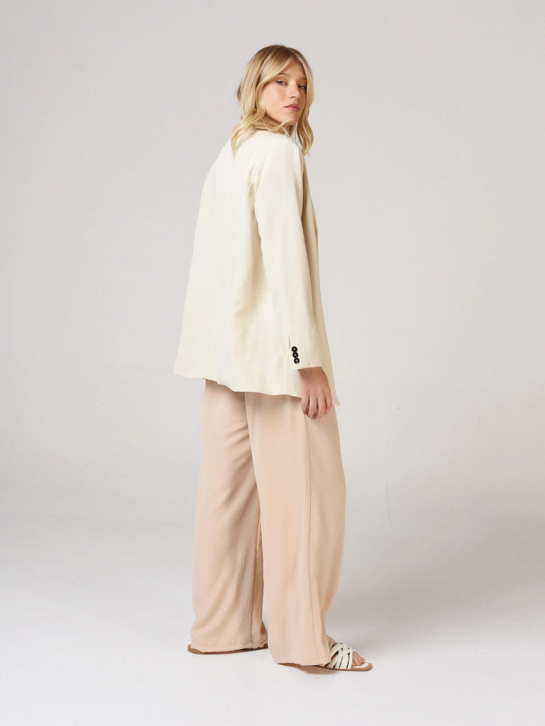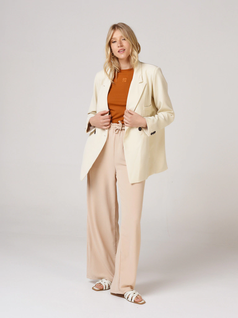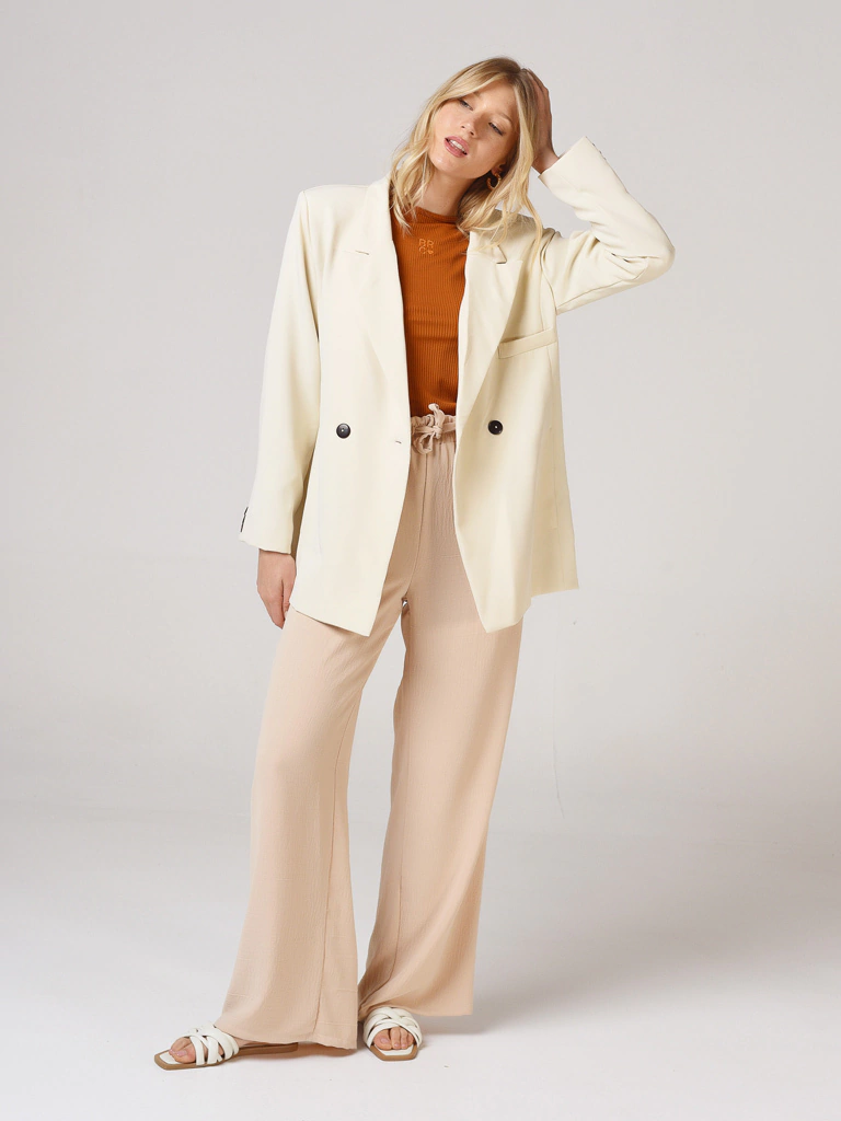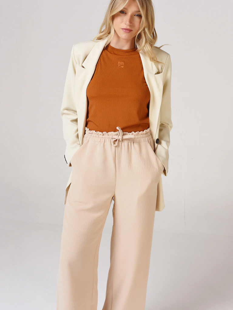 Un nuevo pantalon extra comfy pero que viste mil! Esta hecho en seda arrugada, un genero liviano de mano rugosa y opaco. Tiene cintura elastica con efecto paperbag + lazos para ajustar y anudar y bolsillos claro!