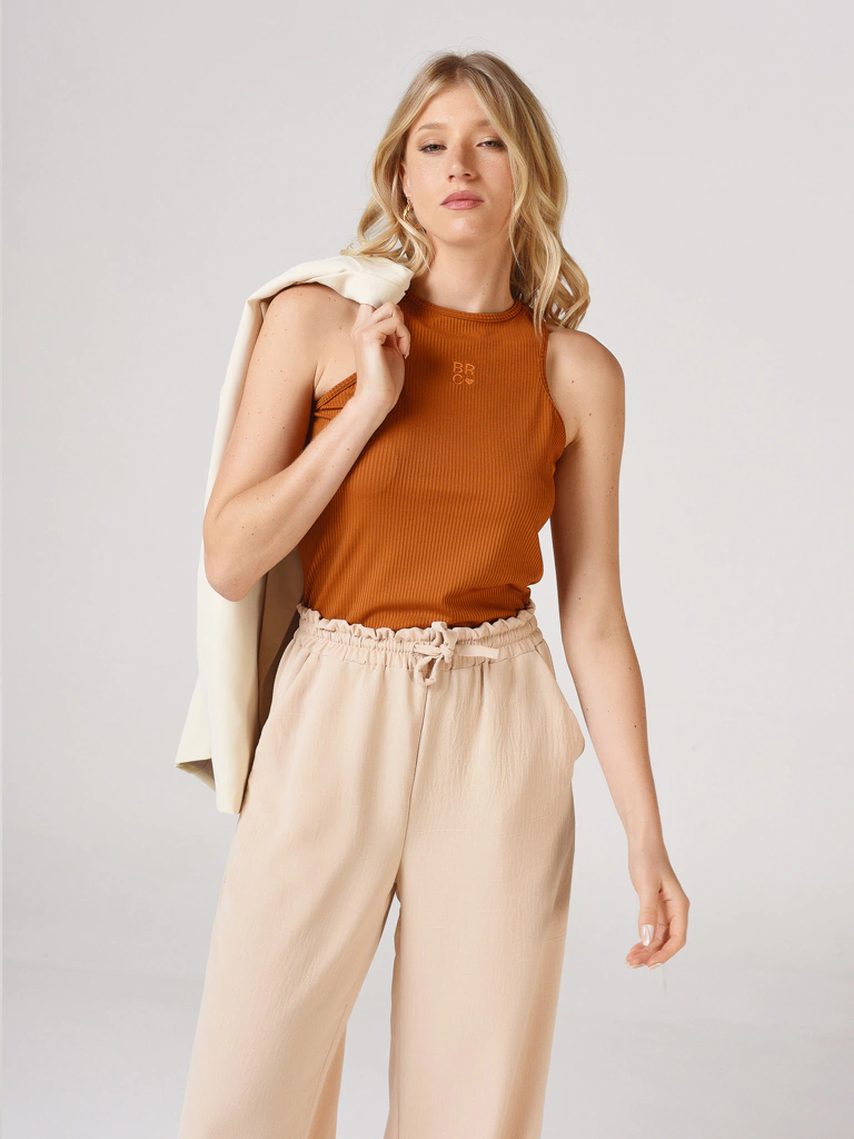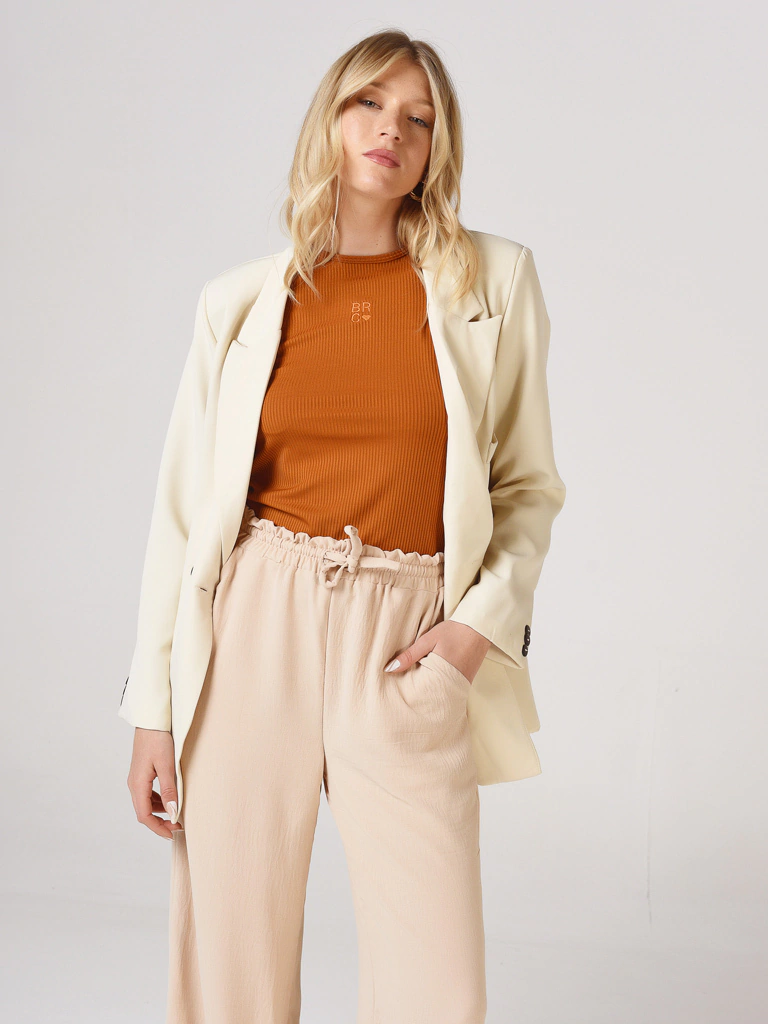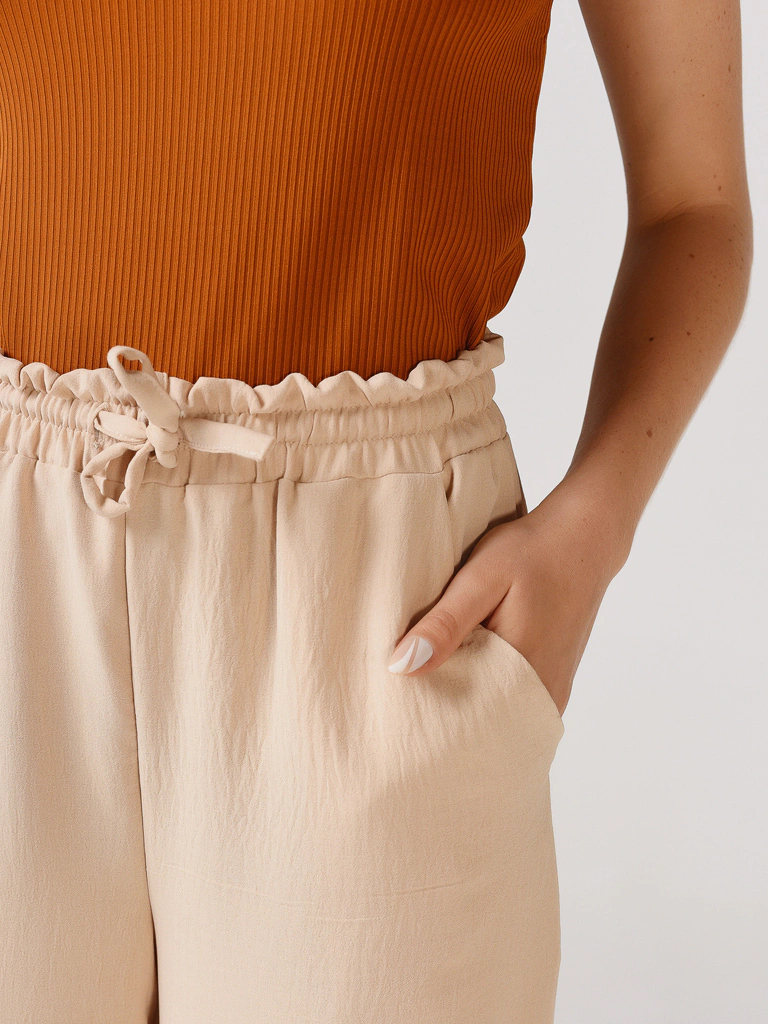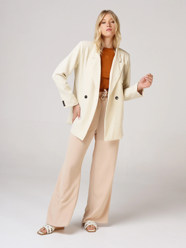 Un nuevo pantalon extra comfy pero que viste mil! Esta hecho en seda arrugada, un genero liviano de mano rugosa y opaco. Tiene cintura elastica con efecto paperbag + lazos para ajustar y anudar y bolsillos claro!