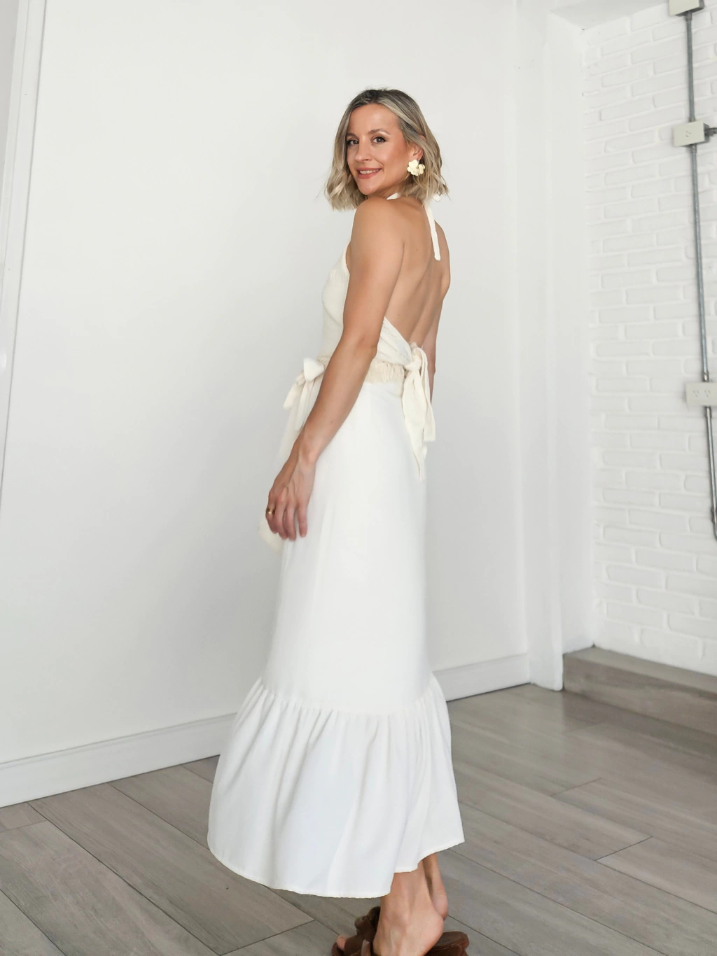 UN top escote halter que grita verano! Hecho en un genero con textura tramada hermosa y con el detalle de flecos en el ruedo. Se anuda tanto en cuello como espalda!