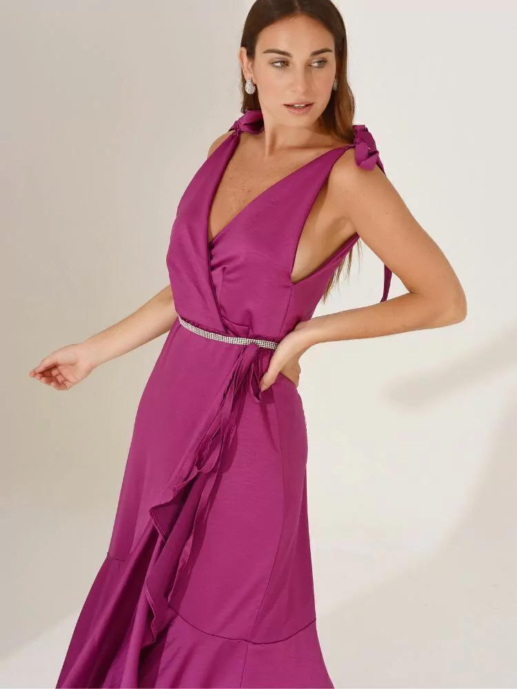 Un nuevo vestido tipo portafolio que vas a amar. Hecho en seda satinada, con volado flare en el ruedo y busto regulable con lazos anudados. Moños, volados, caida hermosa y vuelo, que mas podemos pedir?