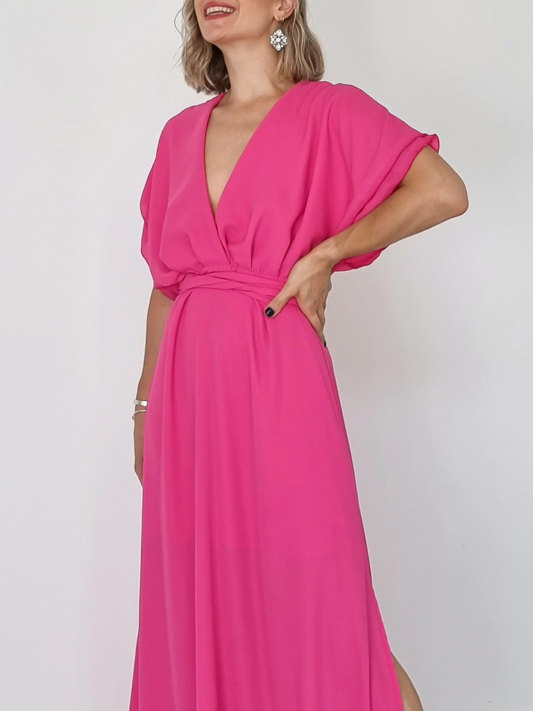 El vestido Runa esta hecho en creppe georgette con MEGA caida, escote cruzado y cintura elastica con lazo para anudar como prefieras! Mangas amplias y de divino vuelo para las fans!