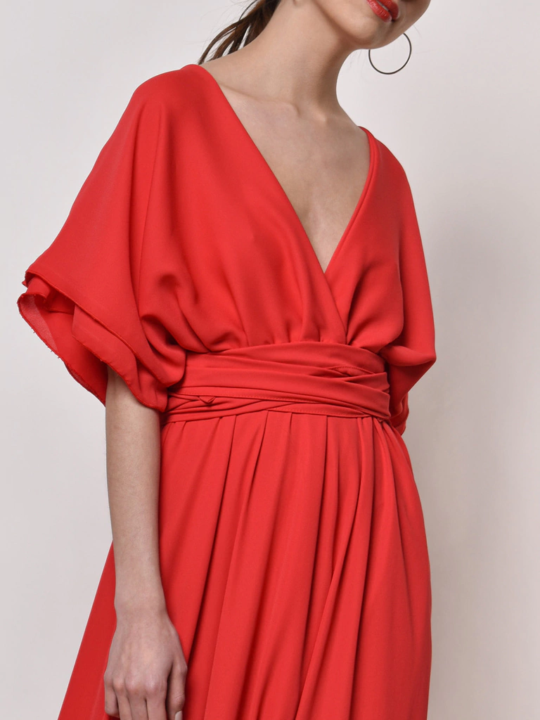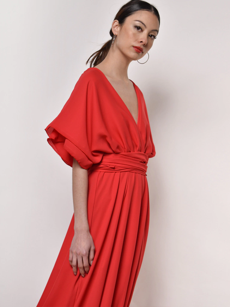 El vestido Runa esta hecho en creppe georgette ( y no escatimamos tela!! ) con MEGA caida, escote cruzado y cintura elastica con lazo para anudar como prefieras! Mangas amplias y de divino vuelo para las fans!